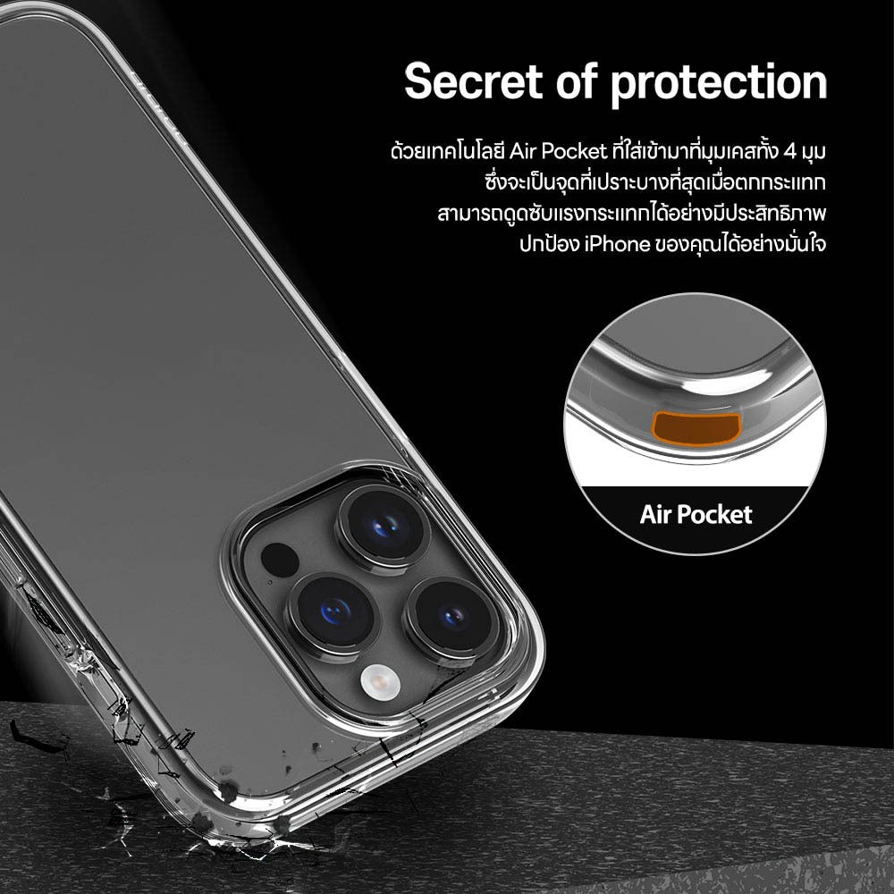 ตัวเคสผสานฝาหลังโพลีคาร์บอเนตใสกับขอบหน้า TPU ใสแข็งแกร่งเข้าด้วยกันอย่างลงตัวพร้อมเทคโนโลยี Air Pocket ช่วยลดแรงกระแทกได้ดีเยี่ยม ทดสอบการกันกระแทกมาตรฐาน Military Grade ยกขอบสูงจากหน้าจอและเลนส์กล้อง ลดการสัมผัสกับพื้นผิวโดยตรง