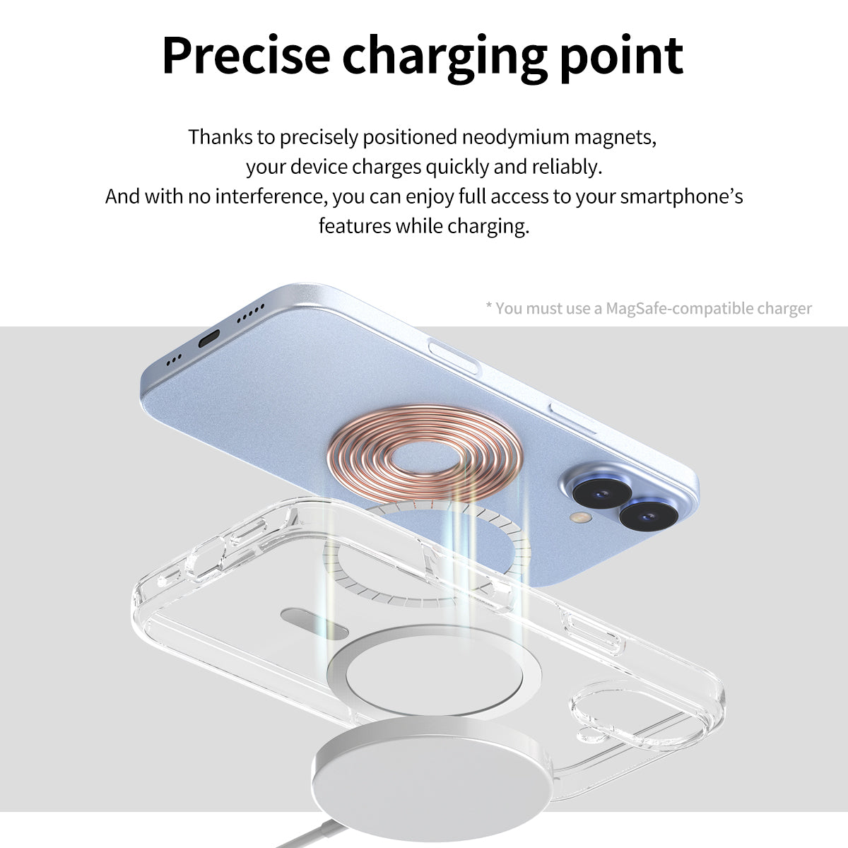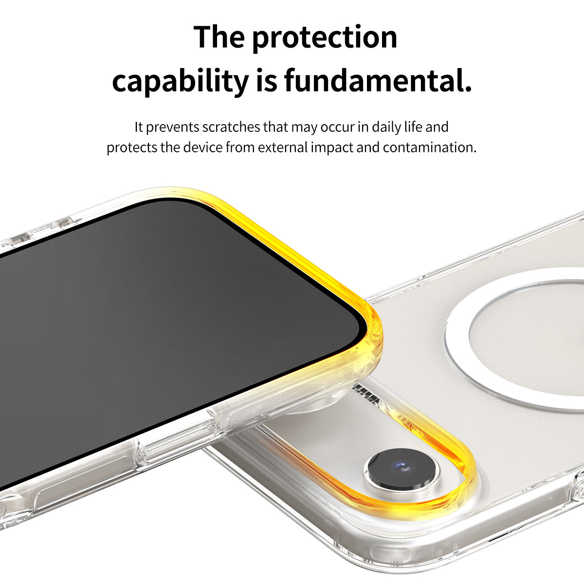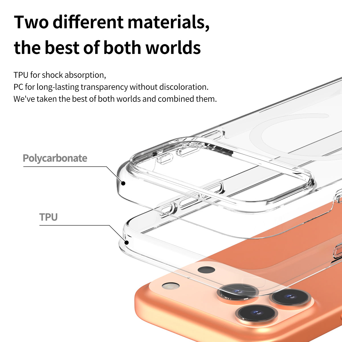 ตัวเคสผสานฝาหลังโพลีคาร์บอเนตใสกับขอบ TPU ใสแข็งแกร่งเข้าด้วยกันอย่างลงตัว ช่วยลดแรงกระแทกและทนต่อรอยขีดข่วนได้ดีเยี่ยม แถมยังยกขอบสูงจากหน้าจอและเลนส์กล้อง ลดการสัมผัสกับพื้นผิวโดยตรง ผิวเคสเคลือบพิเศษ คงความใส ไม่เปลี่ยนสีง่าย ๆ นอกจากนี้ยังมีวงแหวนแม่เหล็กแม็กเซฟ ดูดติดง่าย ติดแน่นอีกด้วย