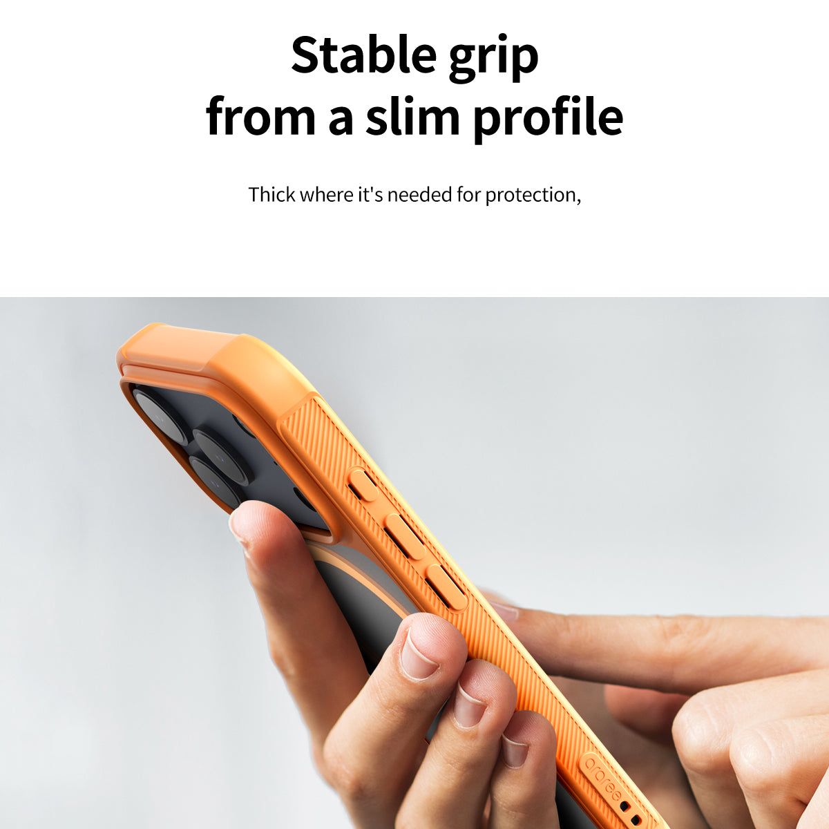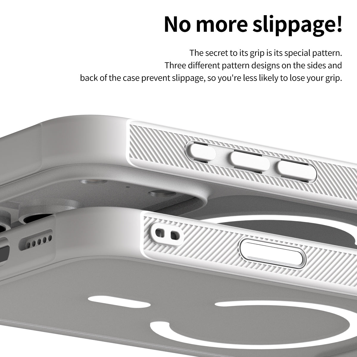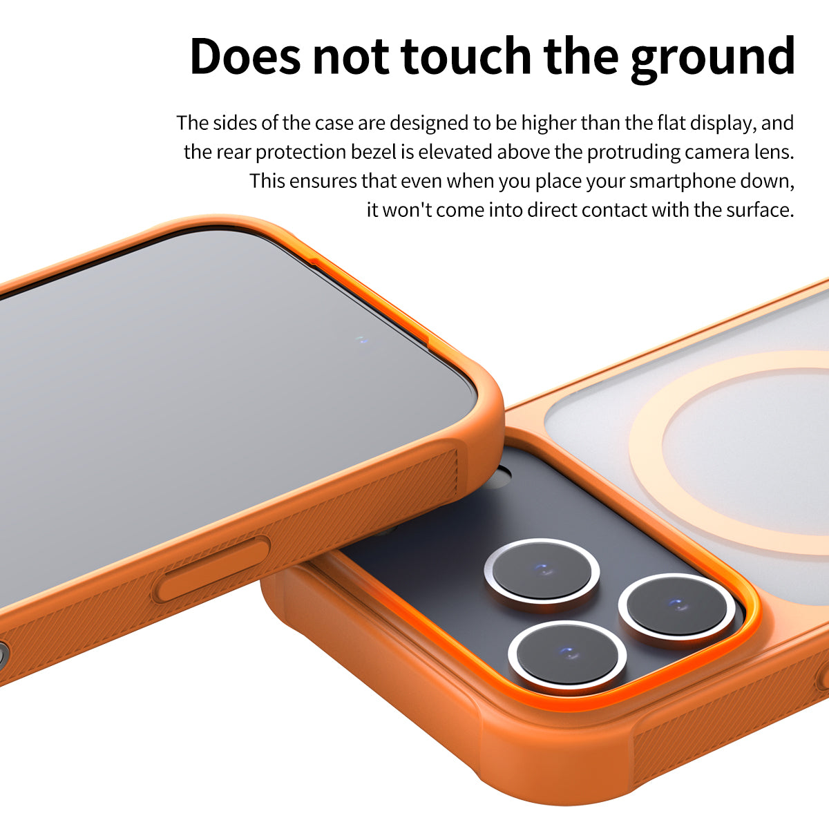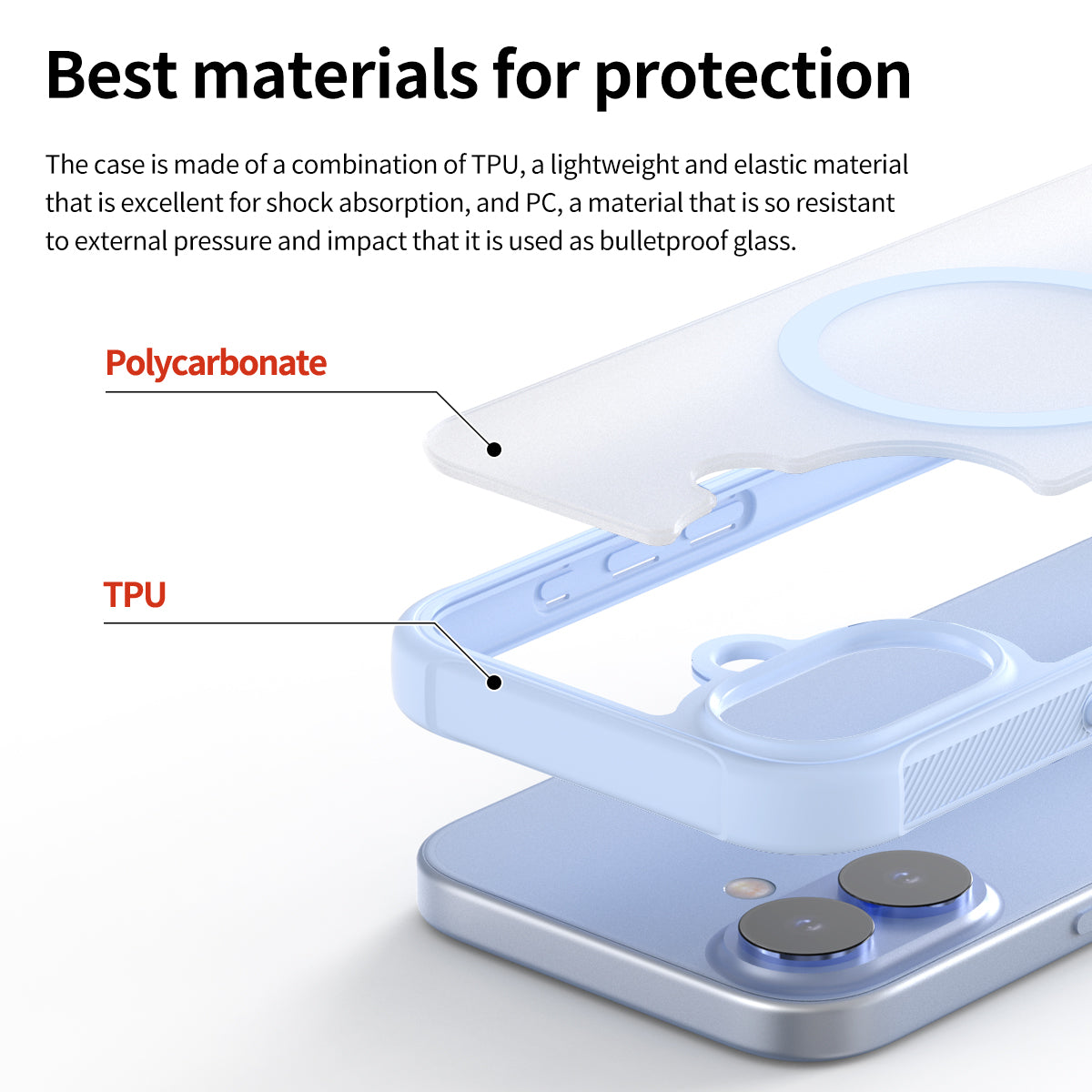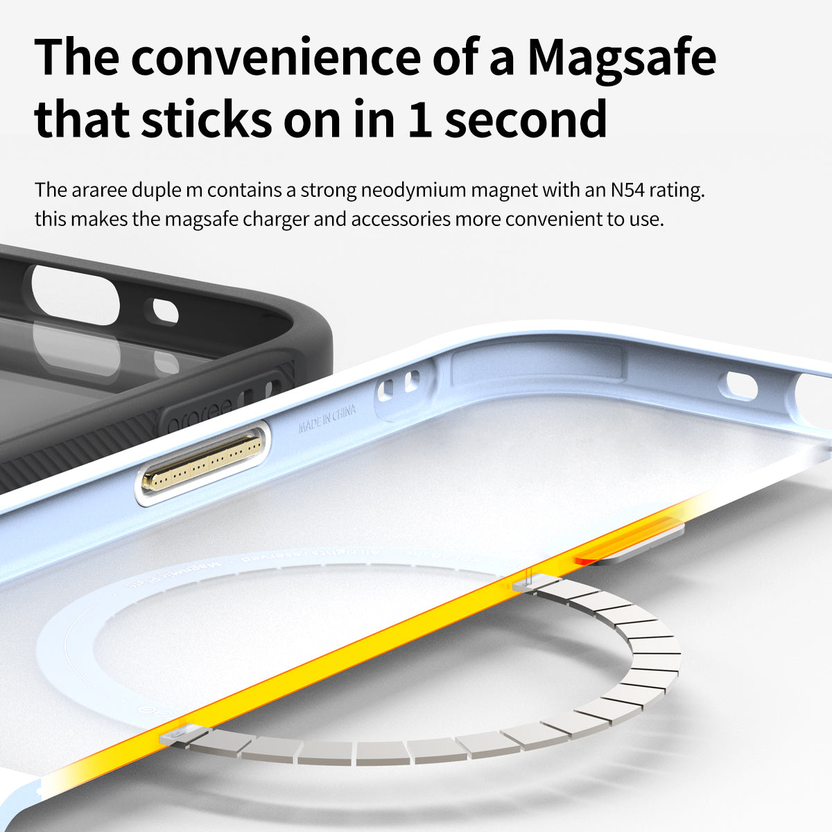 ฝาหลังเคสทำผิวแบบ matte-clear (โปร่งแสงแบบด้าน) เรียบแต่เท่ เดินขอบด้วย TPU กันกระแทกสีเดียวกับตัวเครื่อง แถมยังมีวงแหวนแม่เหล็กแรงสูง N54 ในตัวให้ใช้กับอุปกรณ์เสริมแม็กเซฟได้เต็มประสิทธิภาพ