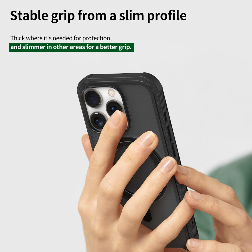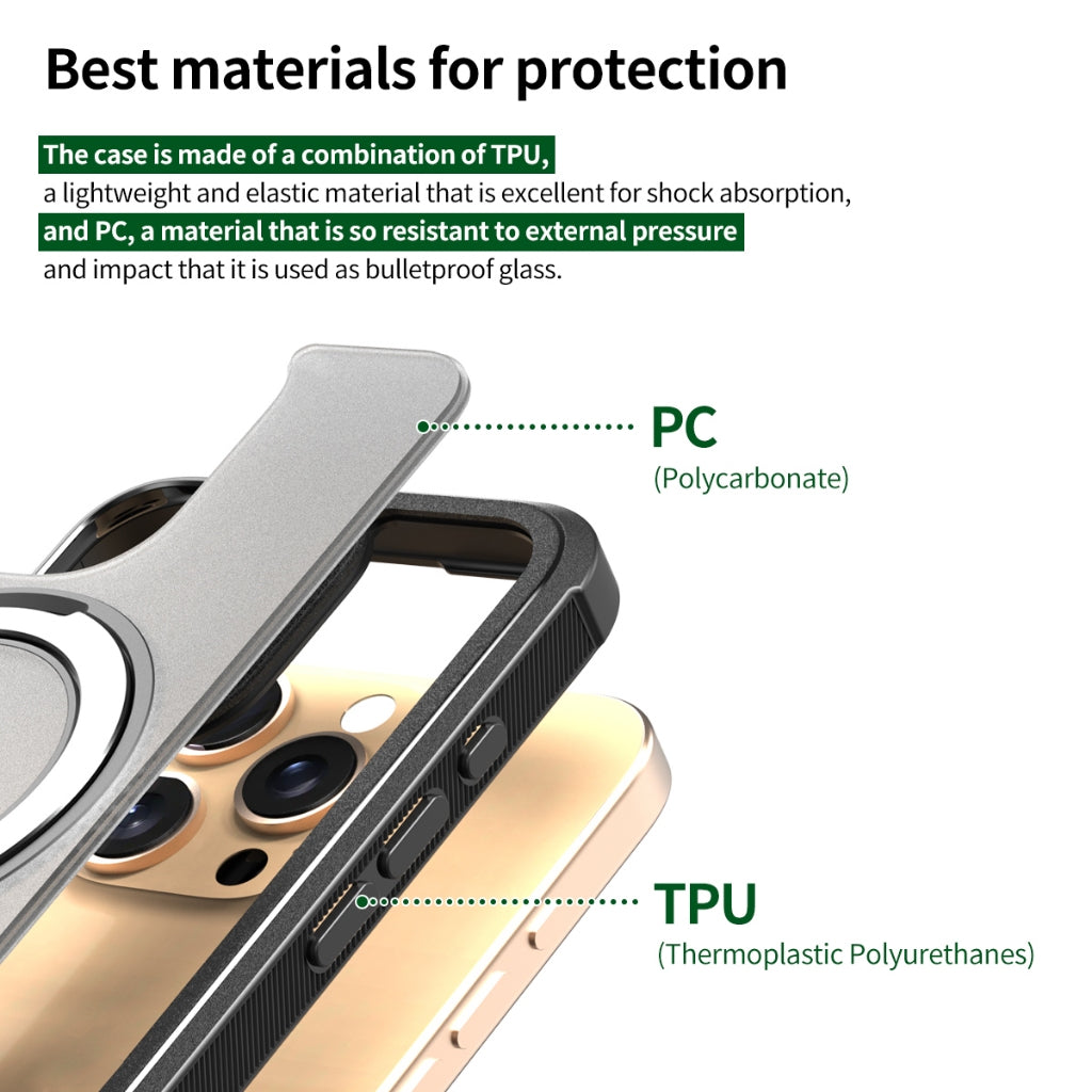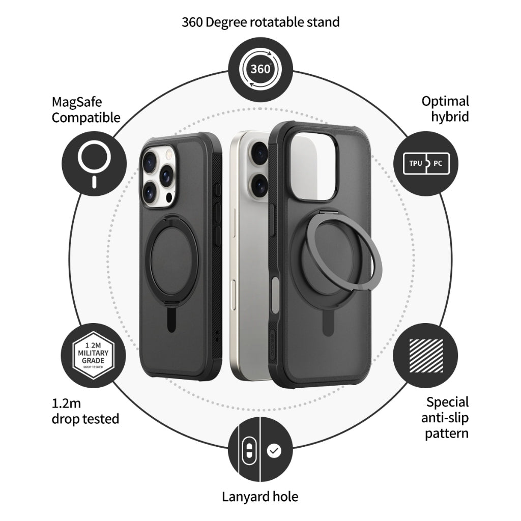 ผลิตจากโพลีคาร์บอเนตกับ TPU และมีแถบกันกระแทกเสริมทั้ง 4 มุม ปกป้อง 16 Pro, 16 Pro Max ได้แข็งแกร่ง มีวงแหวนแม่เหล็กแรงสูง N52 สำหรับ MS ซึ่งกางออกมาเป็นขาตั้งได้ แถมหมุนได้ 360º ตั้งได้หลายมุม หลายระดับ วางได้ทั้งแนวตั้ง แนวนอน ใช้งานสะดวกสุด ๆ