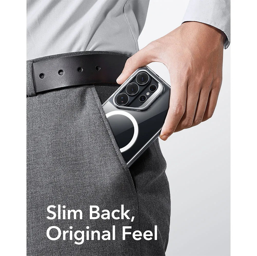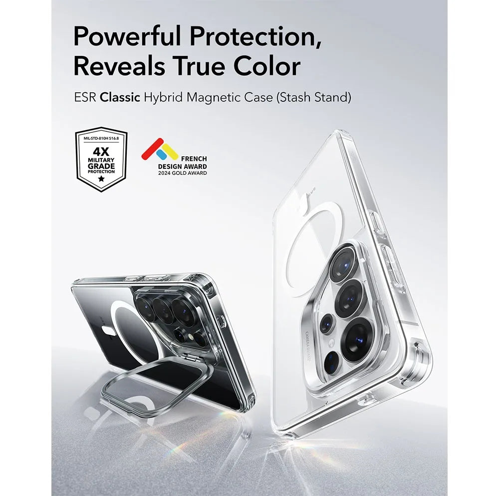 ESR Classic Hybrid เคสสำหรับ Samsung ที่ออกแบบมาให้ครบทั้งฟังก์ชันและสไตล์ ตัวเคสเป็น Hybrid PC + TPU สไตล์โปร่งแสง โชว์ดีไซน์ Samsung ได้เต็มตา แต่มาพร้อมฟังก์ชัน Stash Stand ที่มีขาตั้งเสริมซ่อนไว้ที่กรอบเลนส์ และตัวเคสยังผ่านการทดสอบ การปกป้องระดับ Military-Grade ถึง 3 เท่าเพื่อให้มั่นใจว่าทนจริง พร้อม Magnetic ที่แน่นมากๆและรองรับการชาร์จไร้สาย (Wireless Charging Compatible)