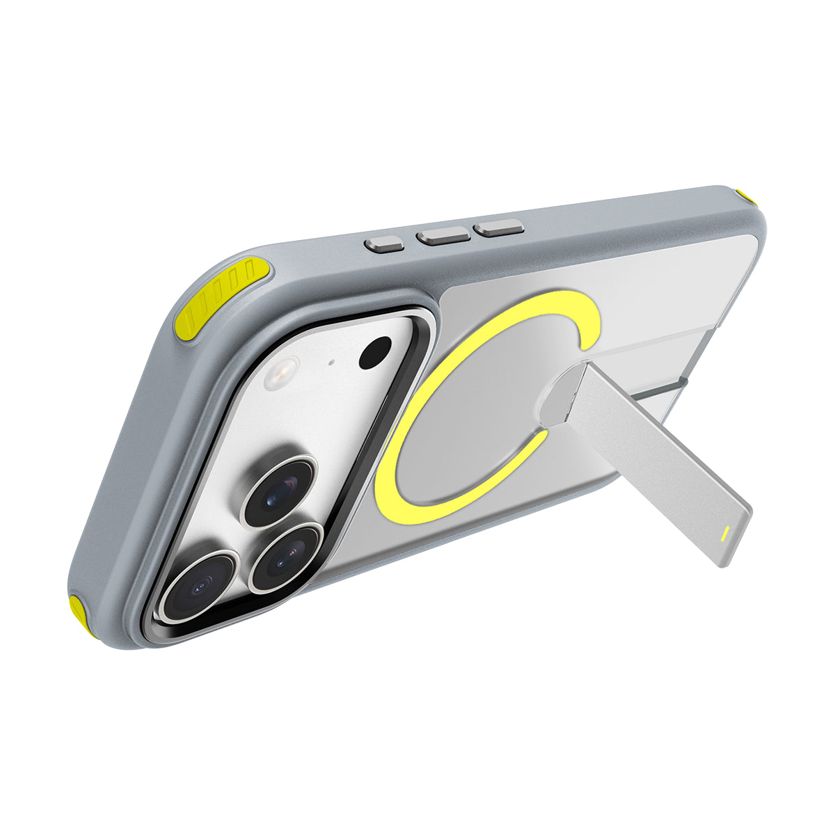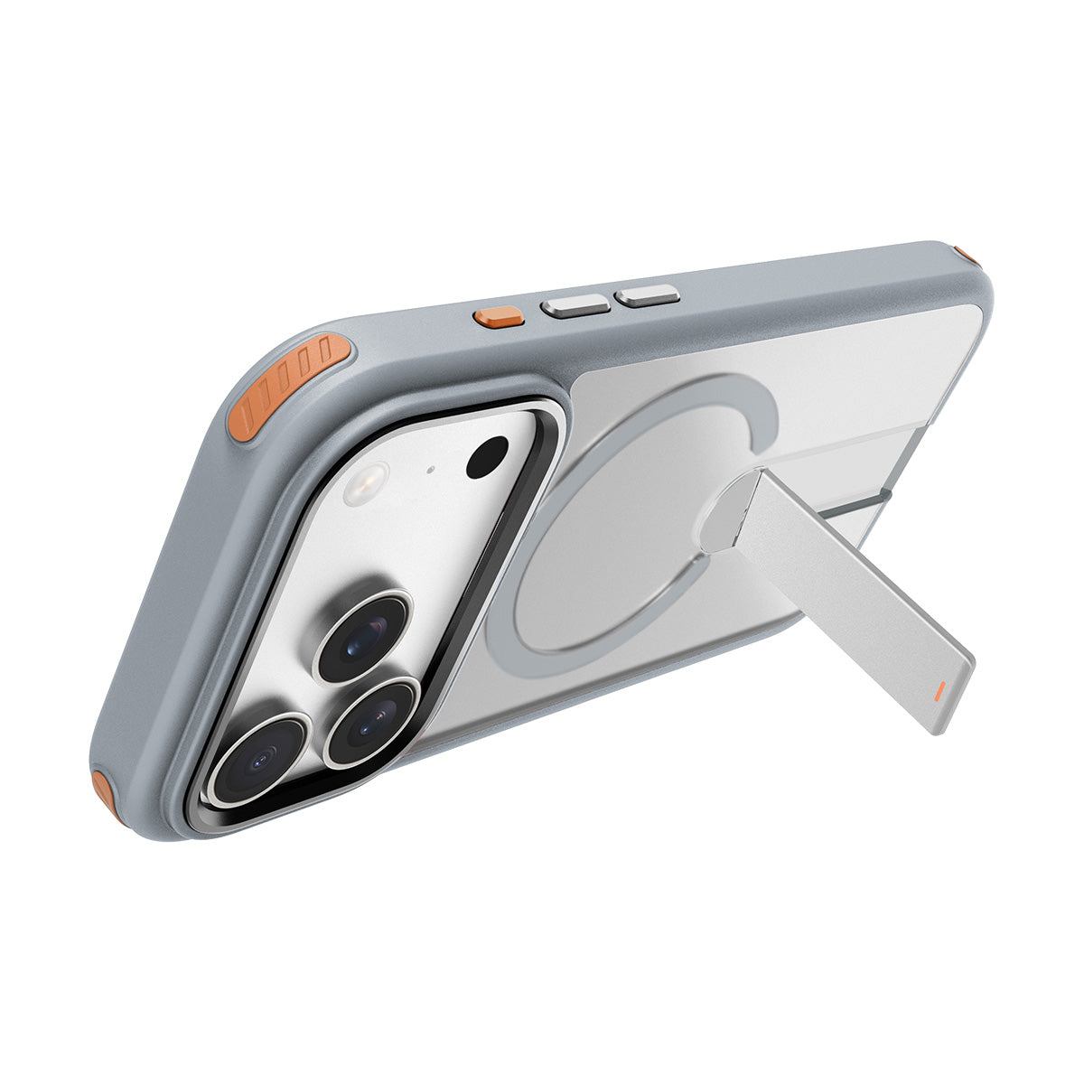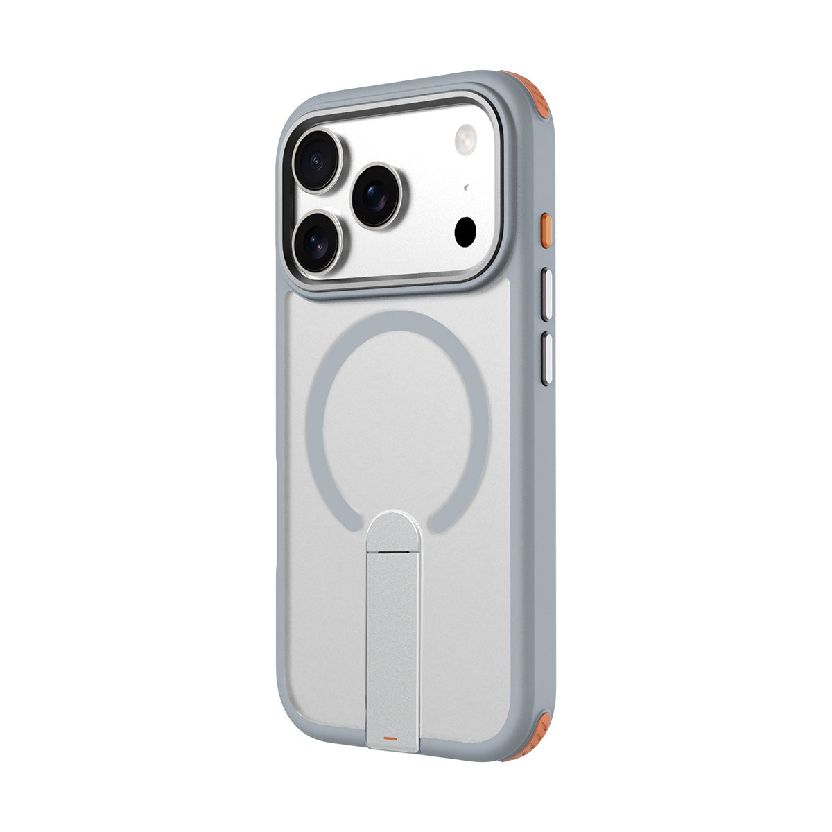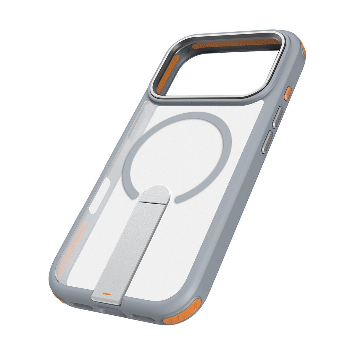 ดีไซน์โดดเด่นด้วยฝาหลังผิว matte-clear (โปร่งแสงผิวด้าน) ตัดกับปุ่มกดสีสดและกรอบเลนส์กล้องอลูมิเนียมสวยหรู พิเศษด้วยขาตั้งในตัว ที่ซ่อนในดีไซน์ด้านหลังเคสได้เนียน ๆ และยังมีวงแม่เหล็กฝังในตัว ใช้งานกับอุปกรณ์เสริม Magsafe ได้อีกด้วย